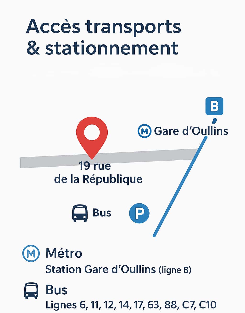 Métro : Station Gare d’Oullins de la ligne B (direction Charpennes / Hôpital Lyon-Sud) à quelques minutes à pied